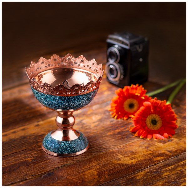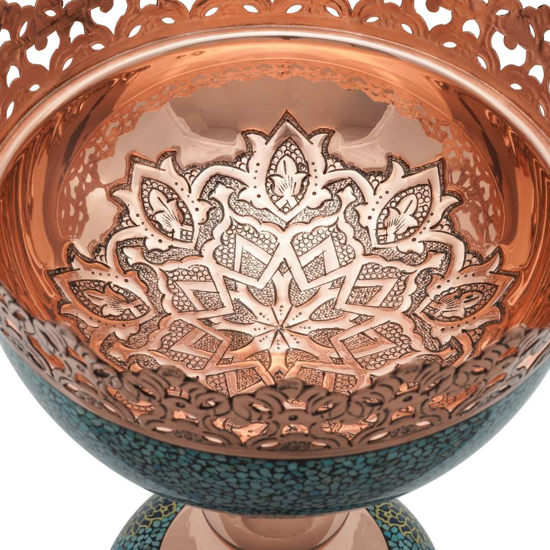 تحفة فنية يدوية من النحاس المرصع بحجارة الفيروز النيشابوري، تعكس أصالة الفن الإيراني وجماله.